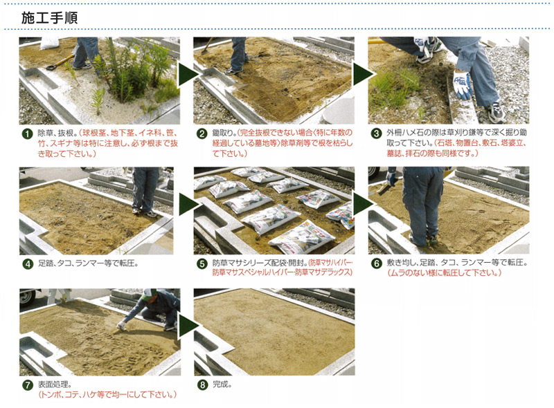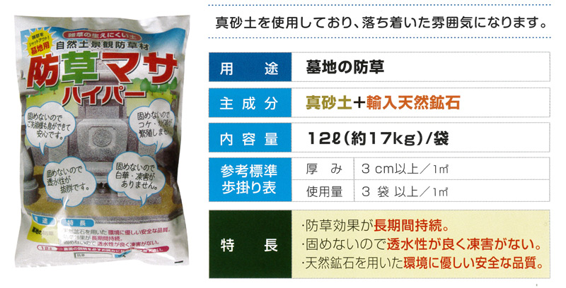 打谷石材では、墓地用の自然土景観防草材「防草マサ」シリーズ(国土交通省NETIS新技術登録商品)をお取り扱いしています。